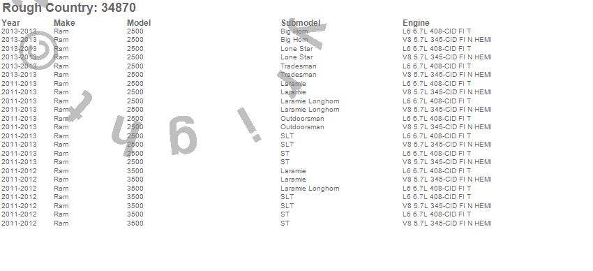 Below is an abbreviated list of applications for the Suspension Lift Kit.2500, 3500, Ram, 2013, 2012, 2011