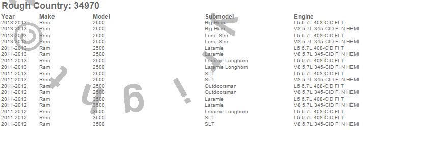Below is an abbreviated list of applications for the Suspension Lift Kit.2500, 3500, Ram, 2013, 2012, 2011