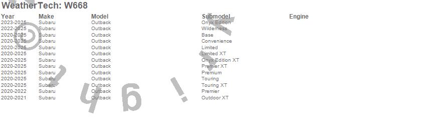 Below is an abbreviated list of applications for the All Weather Floor Mats.Legacy, Outback, Subaru, 2025, 2024, 2023, 2022, 2021, 2020
