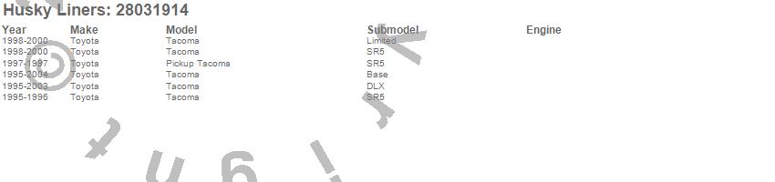 Below is an abbreviated list of applications for the Fender Flares.Tacoma, Toyota, 2004, 2003, 2002, 2001, 2000, 1999, 1998, 1997, 1996, 1995