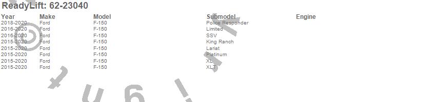 Brand: ReadyLiftPart Number: 62-23040Lift Kit-Suspension Type: 3.5 in. Front Strut Extension - 2.5 in. Rear Pre-Load BlocksUPC: 194933366361