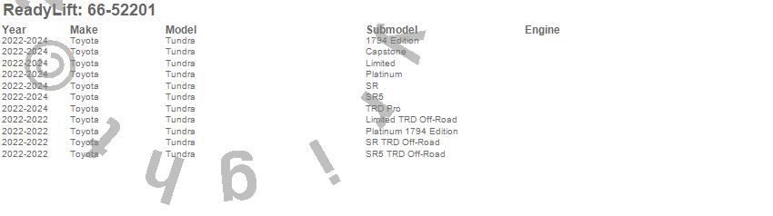 Below is an abbreviated list of applications for the Leveling Kit.Tundra, Toyota, 2025, 2024, 2023, 2022