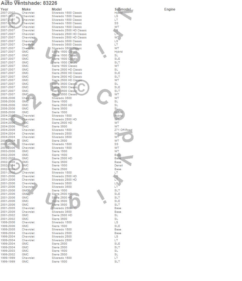 Below is an abbreviated list of applications for the Aeroshade Side Window Cover.Sierra 1500, Sierra 1500 Classic, Sierra 2500, Sierra 2500 HD, Sierra 2500 HD Classic, Sierra 3500, Sierra 3500 Classic, Silverado 1500, Silverado 1500 Classic, Silverado 2500, Silverado 2500 HD, Silverado 2500 HD Classic, Silverado 3500, Silverado 3500 Classic, Chevrolet, GMC, 2007, 2006, 2005, 2004