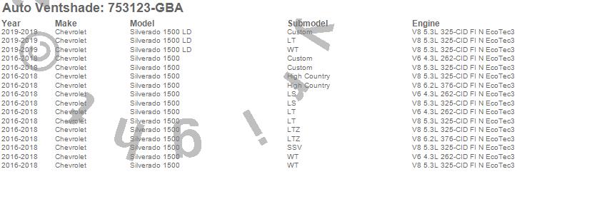 Below is an abbreviated list of applications for the Aeroskin LightShield Color-Match Hood Protector.Silverado 1500, Silverado 1500 LD, Chevrolet, 2019, 2018, 2017, 2016