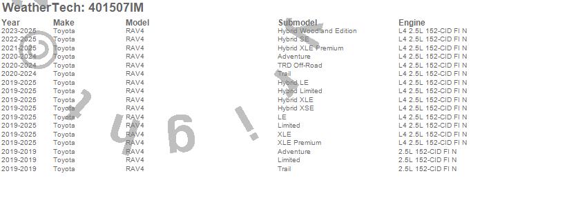 Below is an abbreviated list of applications for the SeatBack Cargo Liner HP.RAV4, Toyota, 2025, 2024, 2023, 2022, 2021, 2020, 2019