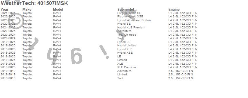 Below is an abbreviated list of applications for the SeatBack Cargo Liner HP w/Bumper Protector.RAV4, Toyota, 2025, 2024, 2023, 2022, 2021, 2020, 2019