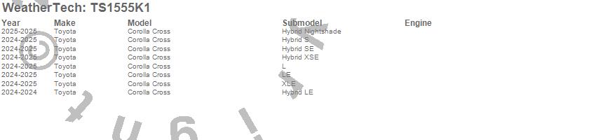 Below is an abbreviated list of applications for the WeatherTech SunShade Full Vehicle Kit.Corolla Cross, Toyota, 2025, 2024