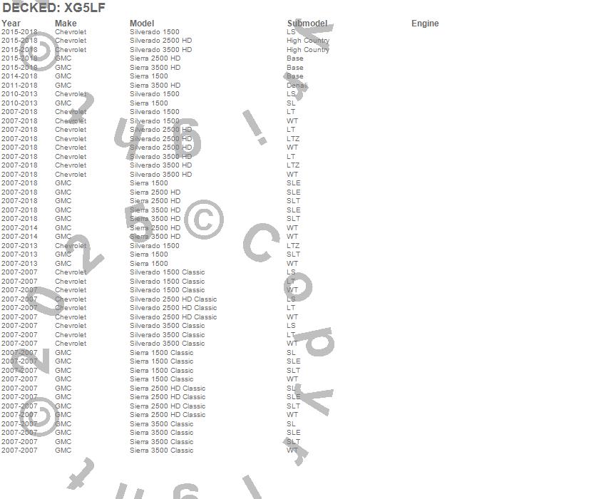Below is an abbreviated list of applications for the DECKED Two Drawer Storage System.Sierra 1500, Sierra 1500 Classic, Sierra 2500 HD, Sierra 2500 HD Classic, Sierra 3500 Classic, Sierra 3500 HD, Silverado 1500, Silverado 1500 Classic, Silverado 2500 HD, Silverado 2500 HD Classic, Silverado 3500 Classic, Silverado 3500 HD, Chevrolet, GMC, 2018, 2017, 2016, 2015, 2014, 2013