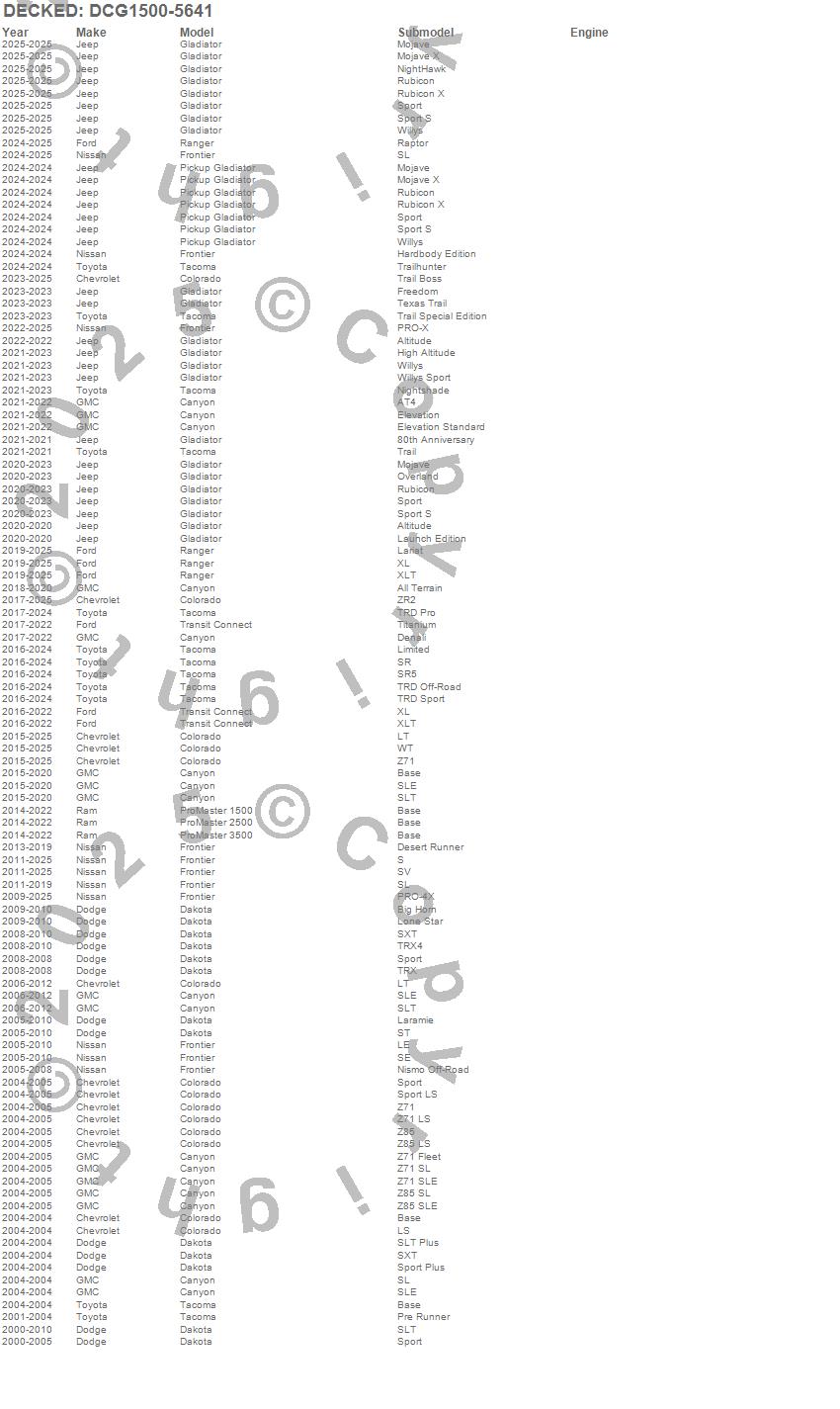 Brand: DECKEDPart Number: DCG1500-5641Rollout Cargo Bed Type: 56 x 41 in. - 75 Percent Extension - 1500 lbs. CapacityUPC: 815294026069