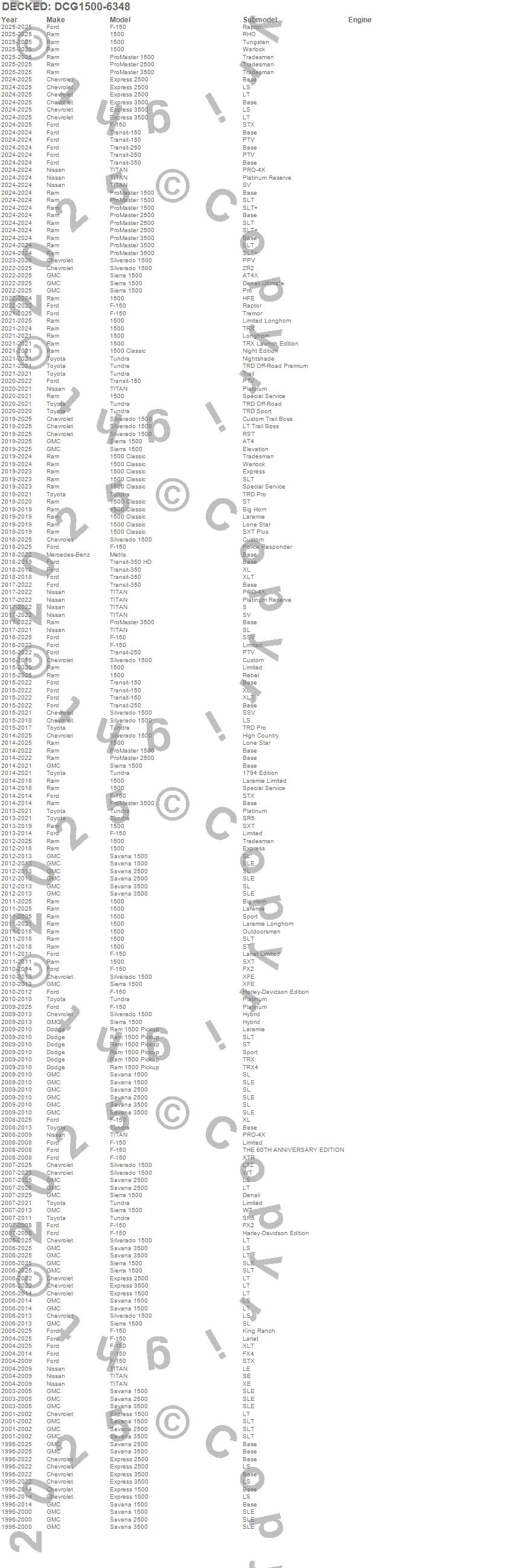 Brand: DECKEDPart Number: DCG1500-6348Rollout Cargo Bed Type: 63 x 48 in. - 75 Percent Extension - 1500 lbs. CapacityUPC: 815294026083