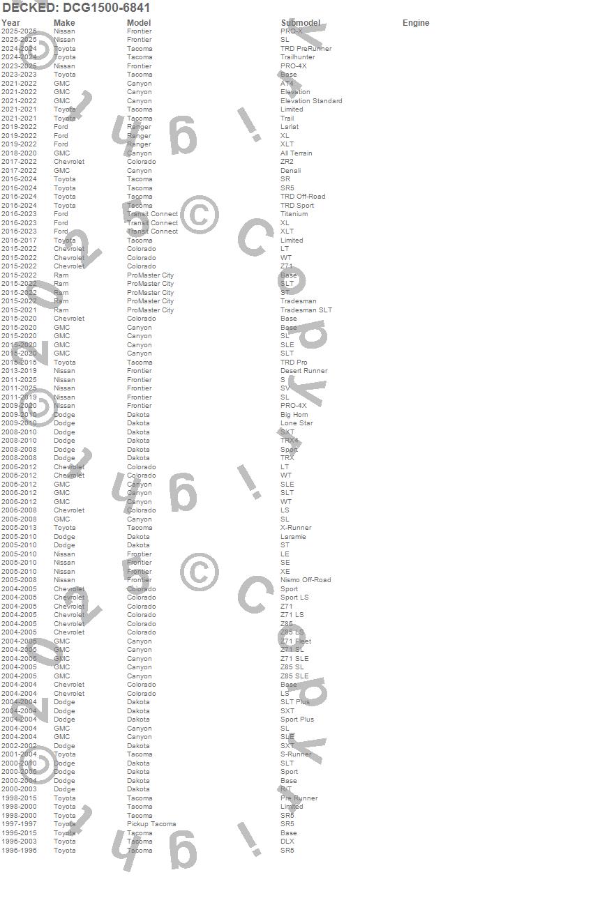 Brand: DECKEDPart Number: DCG1500-6841Rollout Cargo Bed Type: 68 x 41 in. - 75 Percent Extension - 1500 lbs. CapacityUPC: 815294026076