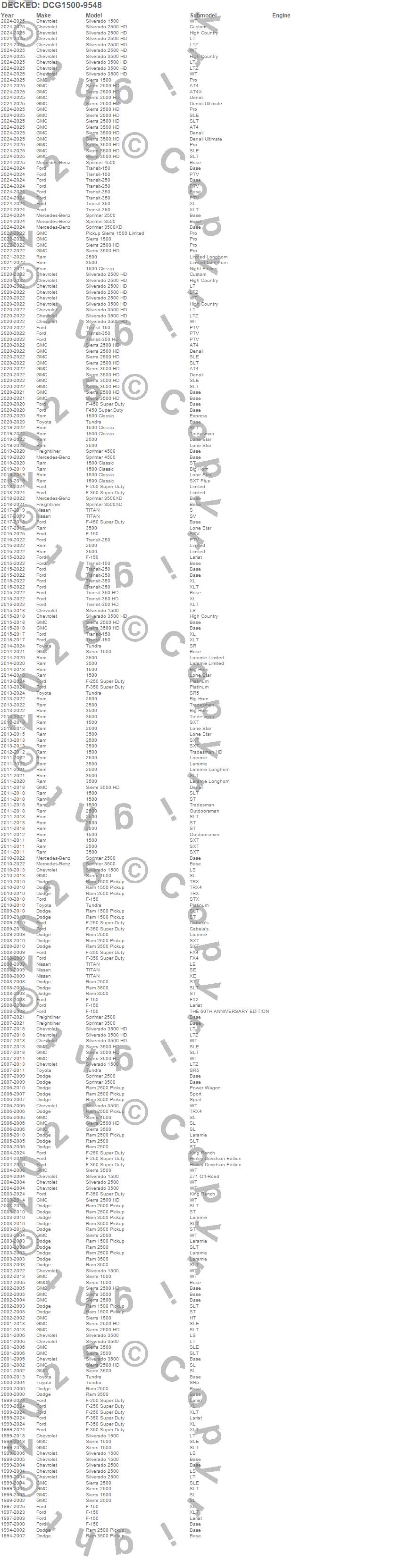 Brand: DECKEDPart Number: DCG1500-9548Rollout Cargo Bed Type: 95 x 48 in. - 75 Percent Extension - 1500 lbs. CapacityUPC: 815294026113