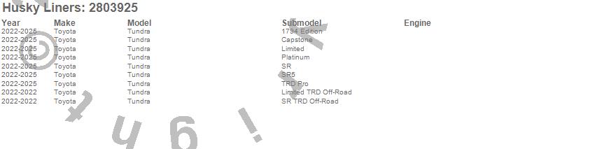 Below is an abbreviated list of applications for the Fender Flares.Tundra, Toyota, 2025, 2024, 2023, 2022