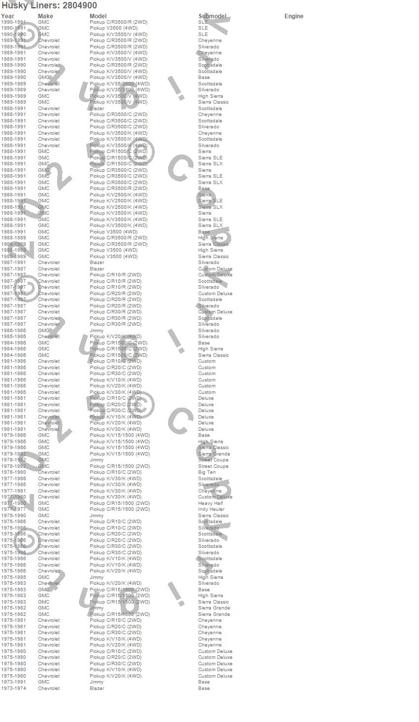 Below is an abbreviated list of applications for the Fender Flares.Blazer, C10 Pickup, C1500 Pickup, C20 Pickup, C30 Pickup, C3500 Pickup, Jimmy, K10 Pickup, K1500 Pickup, K20 Pickup, K2500 Pickup, K30 Pickup, K3500 Pickup, R10 Pickup, R20 Pickup, R30 Pickup, R3500 Pickup, V3500 Pickup, Chevrolet, GMC