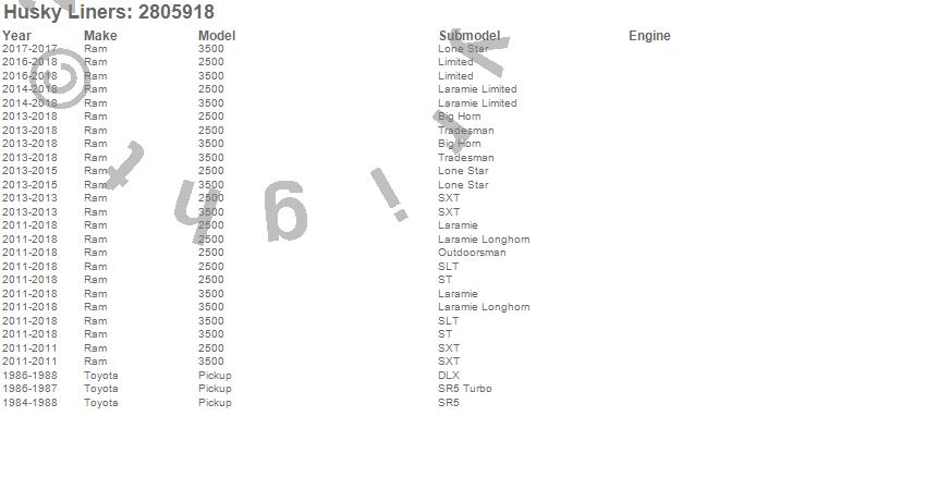 Below is an abbreviated list of applications for the Fender Flares.2500, 3500, Pickup, Ram, Toyota, 2018, 2017, 2016, 2015, 2014, 2013, 2012, 2011, 1988, 1987, 1986, 1985, 1984