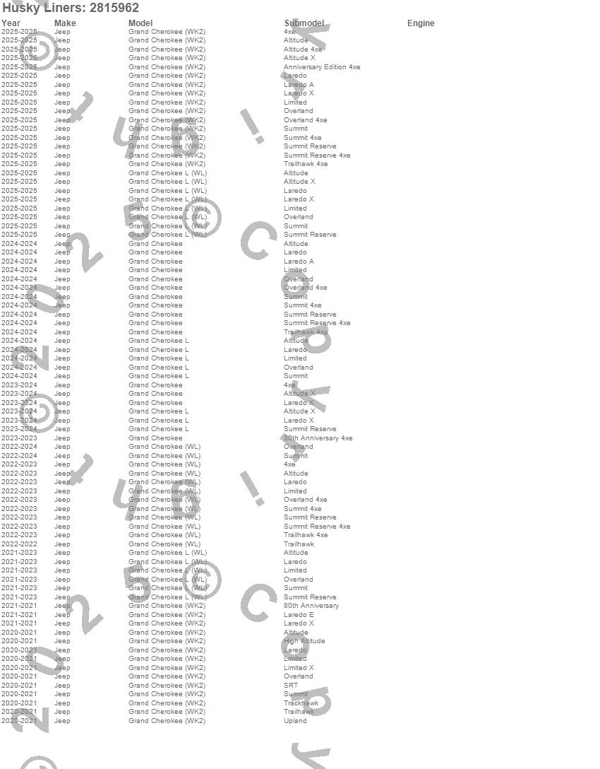 Below is an abbreviated list of applications for the Hood Shield.Grand Cherokee, Grand Cherokee (WK2), Grand Cherokee (WL), Grand Cherokee L, Grand Cherokee L (WL), Jeep, 2025, 2024, 2023, 2022, 2021, 2020