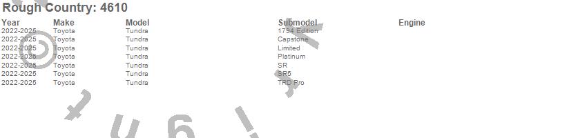 Brand: Rough CountryPart Number: 4610Fender Liner Type: Rear - Pair - Polyethylene Plastic - Incl. Mounting HardwareUPC: 840269963780