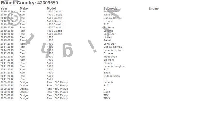 Brand: Rough CountryPart Number: 42309550Tonneau Cover Type: Textured - Leather-Grain Vinyl - Tailgate - Velcro Side RailsUPC: 840269942044
