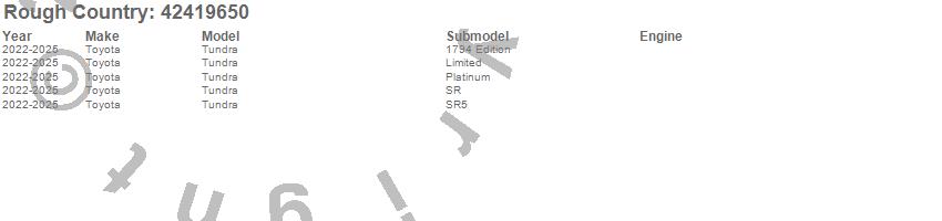 Brand: Rough CountryPart Number: 42419650Tonneau Cover Type: Textured - Leather-Grain Vinyl - Tailgate - Velcro Side RailsUPC: 840269946820