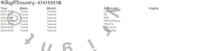 Brand: Rough CountryPart Number: 47415551BTonneau Cover Type: Textured Black Powder Coat - Aluminum - TailgateUPC: 840269950100
