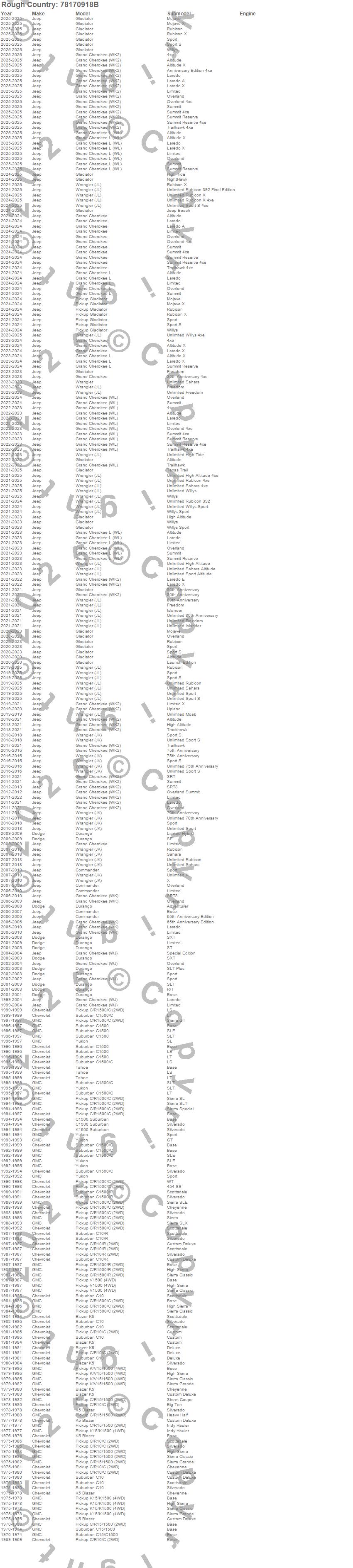 Below is an abbreviated list of applications for the Series 78 Wheel.Blazer K5, C10 Pickup, C10 Suburban, C15/C1500 Suburban, C1500 Pickup, C1500 Suburban, Commander, Durango, Gladiator, Grand Cherokee, Grand Cherokee (WJ), Grand Cherokee (WK), Grand Cherokee (WK2), Grand Cherokee (WL), Grand Cherokee L, Grand Cherokee L (WL), K1500 Pickup, K1500 Suburban, K5 Blazer, Pickup Gladiator