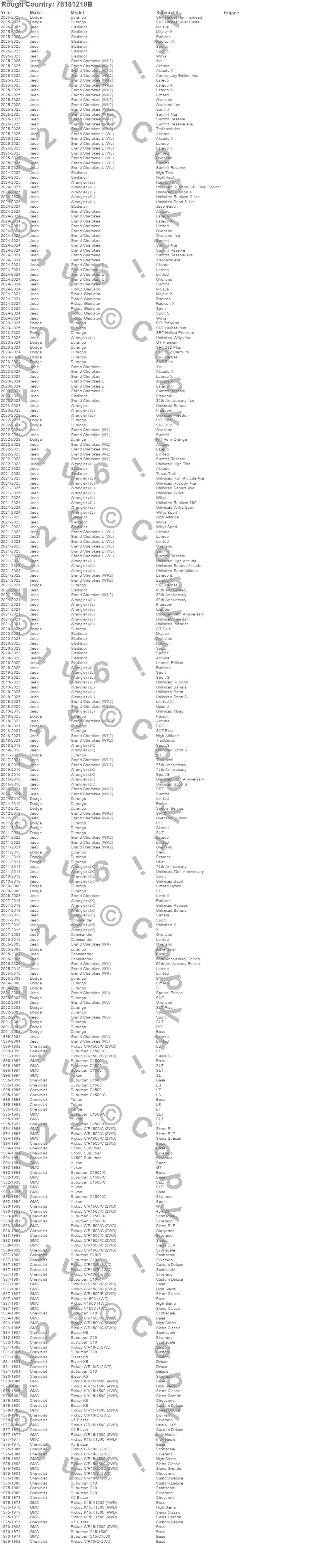 Below is an abbreviated list of applications for the Series 78 Wheel.Blazer K5, C10 Pickup, C10 Suburban, C15/C1500 Suburban, C1500 Pickup, C1500 Suburban, Commander, Durango, Gladiator, Grand Cherokee, Grand Cherokee (WJ), Grand Cherokee (WK), Grand Cherokee (WK2), Grand Cherokee (WL), Grand Cherokee L, Grand Cherokee L (WL), K1500 Pickup, K1500 Suburban, K5 Blazer, Pickup Gladiator