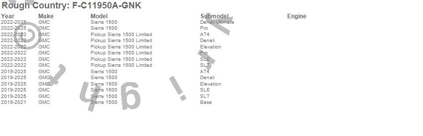 Brand: Rough CountryPart Number: F-C11950A-GNKFender Flare Type: GNK-Brownstone - 2 in. Tire Coverage - 6.5 in. Flare HeightUPC: 840269960789
