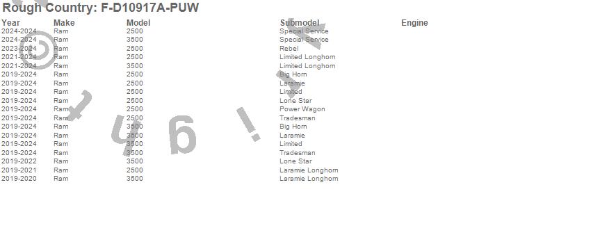 Brand: Rough CountryPart Number: F-D10917A-PUWFender Flare Type: 2 in. Tire Coverage - 5.25 in. Flare Height - PUW Walnut BrownUPC: 840269961274