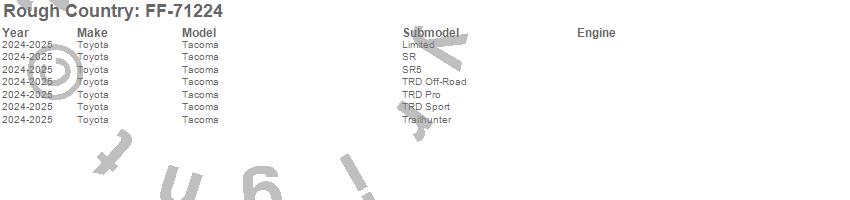 Brand: Rough CountryPart Number: FF-71224Floor Mat Set Type: Front and RearUPC: 840269955570