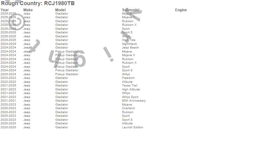 Brand: Rough CountryPart Number: RCJ1980TBNerf/Step Bar Type: 4 Step - 84 in. Length - 465 lbs. Weight RatingUPC: 840269966781