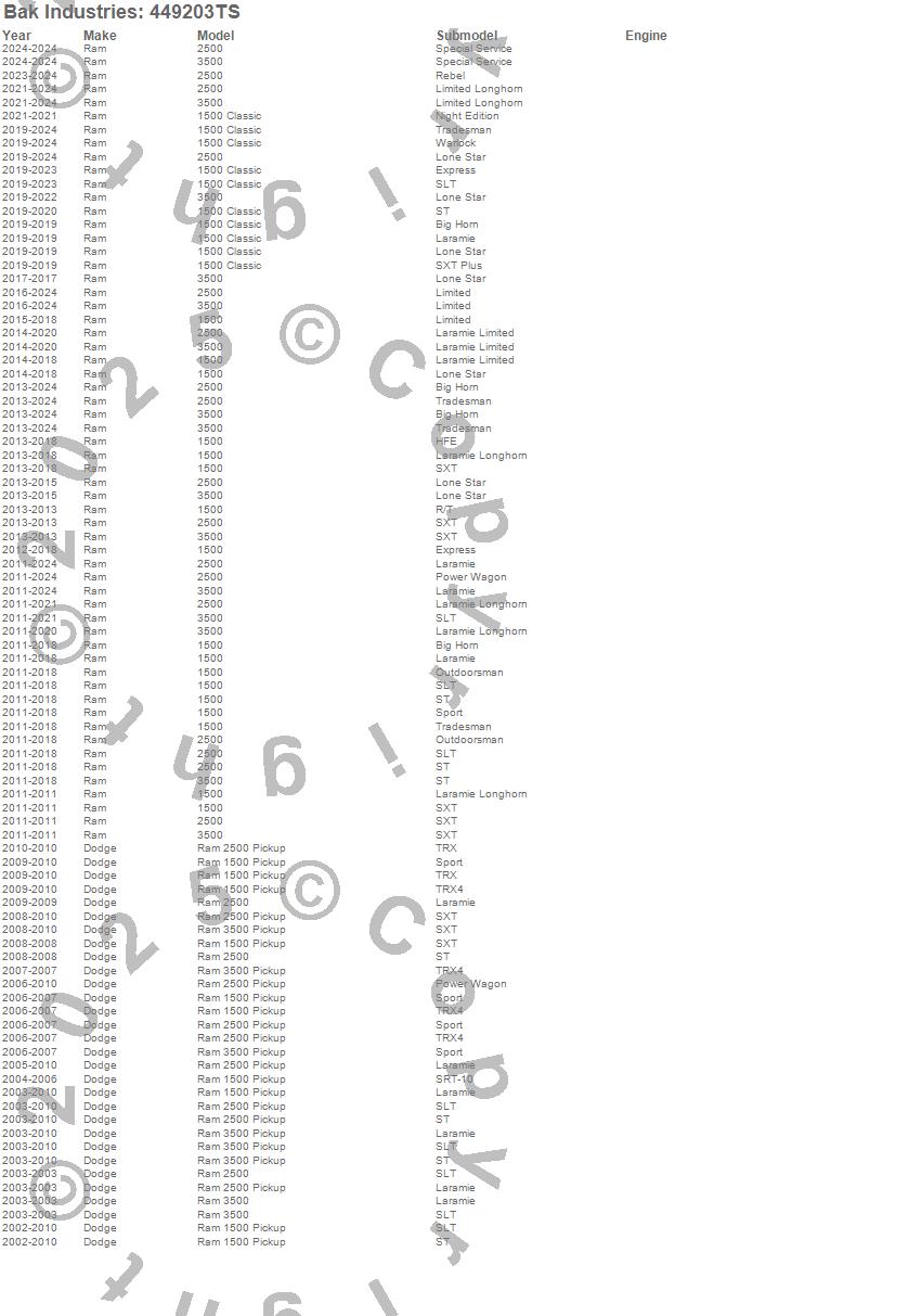 Below is an abbreviated list of applications for the BAKFlip MX4 TS Hard Folding Truck Bed Cover.1500, 1500 Classic, 2500, 3500, Ram 1500, Ram 2500, Ram 3500, Dodge, Ram, 2024, 2023, 2022, 2021, 2020, 2019, 2018, 2017, 2016, 2015, 2014
