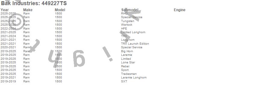 Brand: BAK IndustriesPart Number: 449227TSTonneau Cover Type: Black - Aluminum - Matte FinishUPC: 192631051077