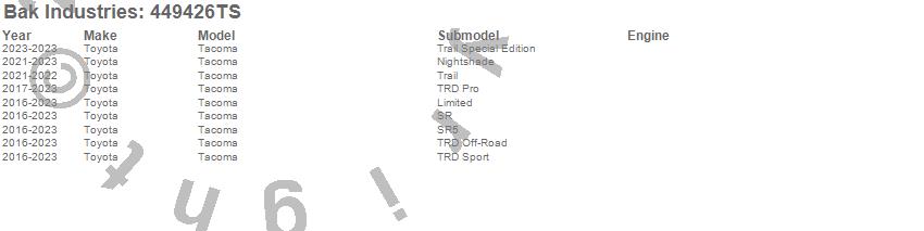 Brand: BAK IndustriesPart Number: 449426TSTonneau Cover Type: Black - Aluminum - Matte FinishUPC: 192631051183