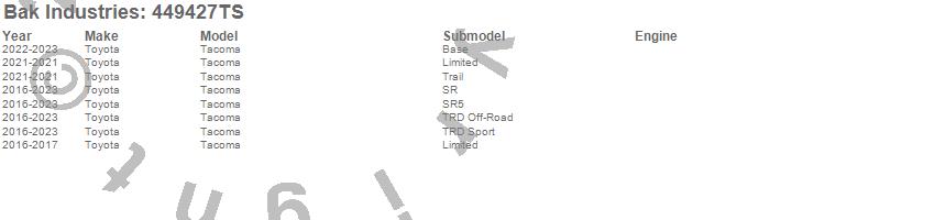Brand: BAK IndustriesPart Number: 449427TSTonneau Cover Type: Black - Aluminum - Matte FinishUPC: 192631051190