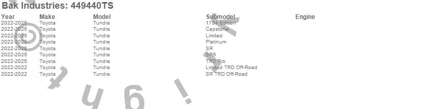 Brand: BAK IndustriesPart Number: 449440TSTonneau Cover Type: Black - Aluminum - Matte FinishUPC: 192631051206