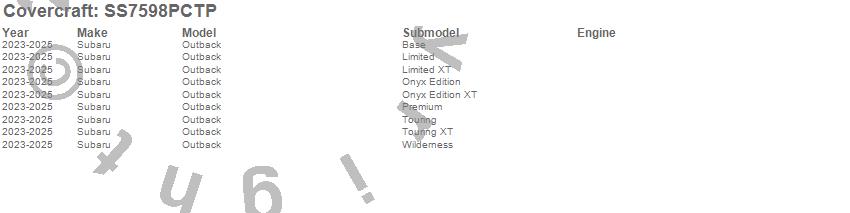 Below is an abbreviated list of applications for the SeatSaver Custom Seat Cover.Outback, Subaru, 2025, 2024, 2023