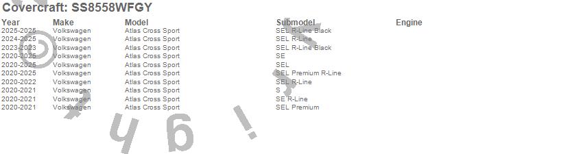 Below is an abbreviated list of applications for the SeatSaver Custom Seat Cover.Atlas Cross Sport, Volkswagen, 2025, 2024, 2023, 2022, 2021, 2020