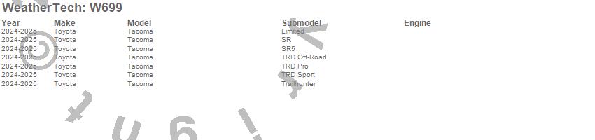 Below is an abbreviated list of applications for the All Weather Floor Mats.Tacoma, Toyota, 2025, 2024