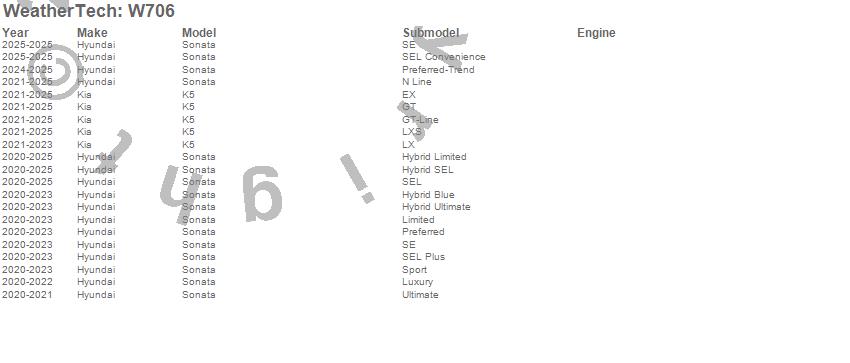Below is an abbreviated list of applications for the All Weather Floor Mats.K5, Sonata, Hyundai, Kia, 2025, 2024, 2023, 2022, 2021, 2020