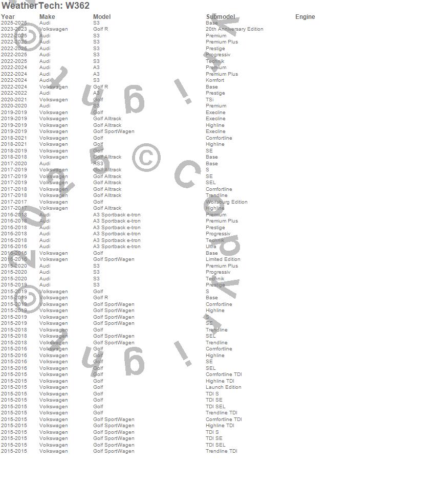 Below is an abbreviated list of applications for the All Weather Floor Mats.A3, A3 Sportback e-tron, Golf, Golf Alltrack, Golf R, Golf SportWagen, RS3, S3, Audi, Volkswagen, 2025, 2024, 2023, 2022, 2021, 2020, 2019, 2018, 2017, 2016