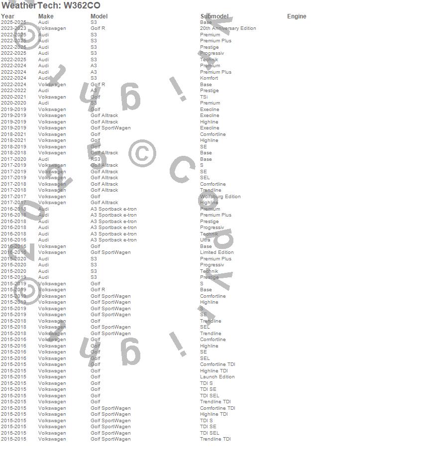 Below is an abbreviated list of applications for the All Weather Floor Mats.A3, A3 Sportback e-tron, Golf, Golf Alltrack, Golf R, Golf SportWagen, RS3, S3, Audi, Volkswagen, 2025, 2024, 2023, 2022, 2021, 2020, 2019, 2018, 2017, 2016