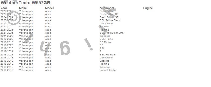 Below is an abbreviated list of applications for the All Weather Floor Mats.Atlas, Volkswagen, 2026, 2025, 2024, 2023, 2022, 2021, 2020, 2019, 2018