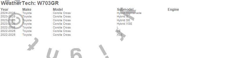 Below is an abbreviated list of applications for the All Weather Floor Mats.Corolla Cross, Toyota, 2026, 2025, 2024, 2023, 2022