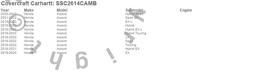Below is an abbreviated list of applications for the Covercraft Carhartt SeatSaver.Accord, Honda, 2022, 2021, 2020, 2019, 2018