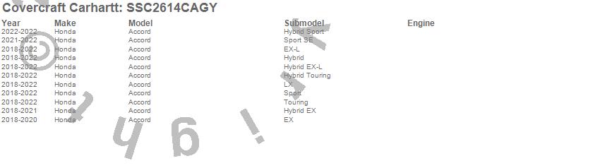 Below is an abbreviated list of applications for the Covercraft Carhartt SeatSaver.Accord, Honda, 2022, 2021, 2020, 2019, 2018