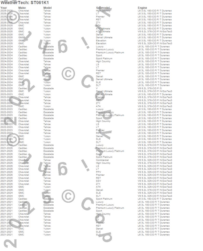 Below is an abbreviated list of applications for the Sill Protector.Escalade, Tahoe, Yukon, Cadillac, Chevrolet, GMC, 2026, 2025, 2024, 2023, 2022, 2021
