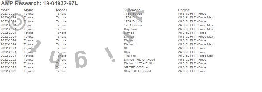 Below is an abbreviated list of applications for the PowerStep XL Wire Harness.Tundra, Toyota, 2024, 2023, 2022