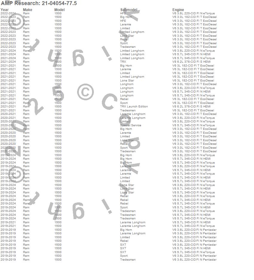 Brand: AMP ResearchPart Number: 21-04054-77.5Power Running Board Type: UPC: 815410017490
