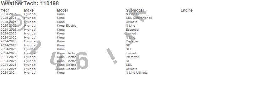 Below is an abbreviated list of applications for the MudFlap No-Drill DigitalFit.Kona, Kona Electric, Hyundai, 2025, 2024