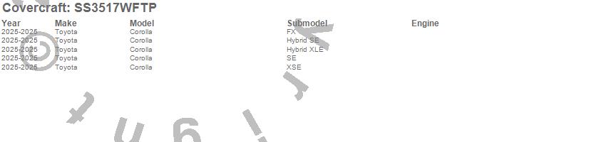 Below is an abbreviated list of applications for the SeatSaver Custom Seat Cover.Corolla, Toyota, 2025